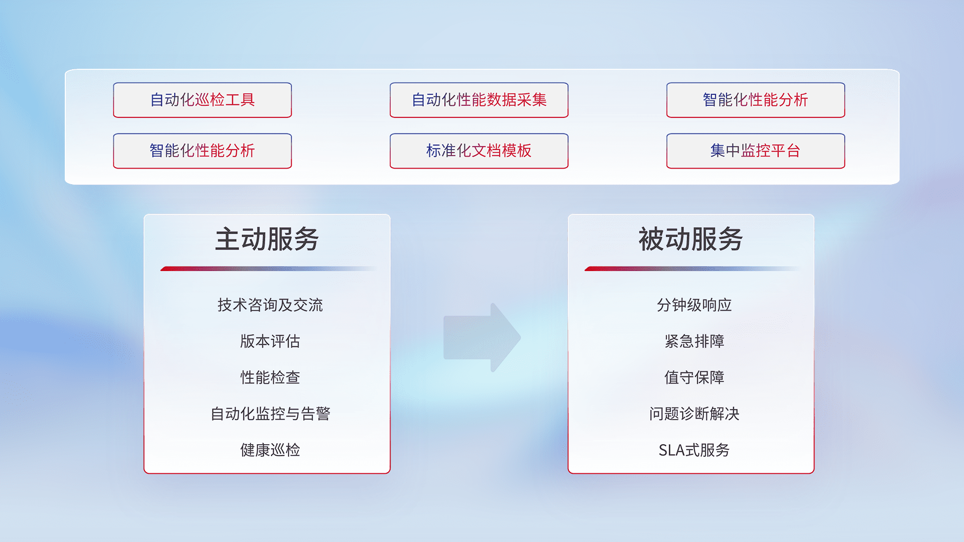 智能化工具和标准化文档,,保障服务质量,,提供主动服务(包含技术咨询、、版本评估、、、、性能检查、、、、自动化监控与告警、、健康巡检)和被动服务包含(分钟级响应、、紧急排障、、值守保障、、问题诊断解决、、、SLA服务)。。