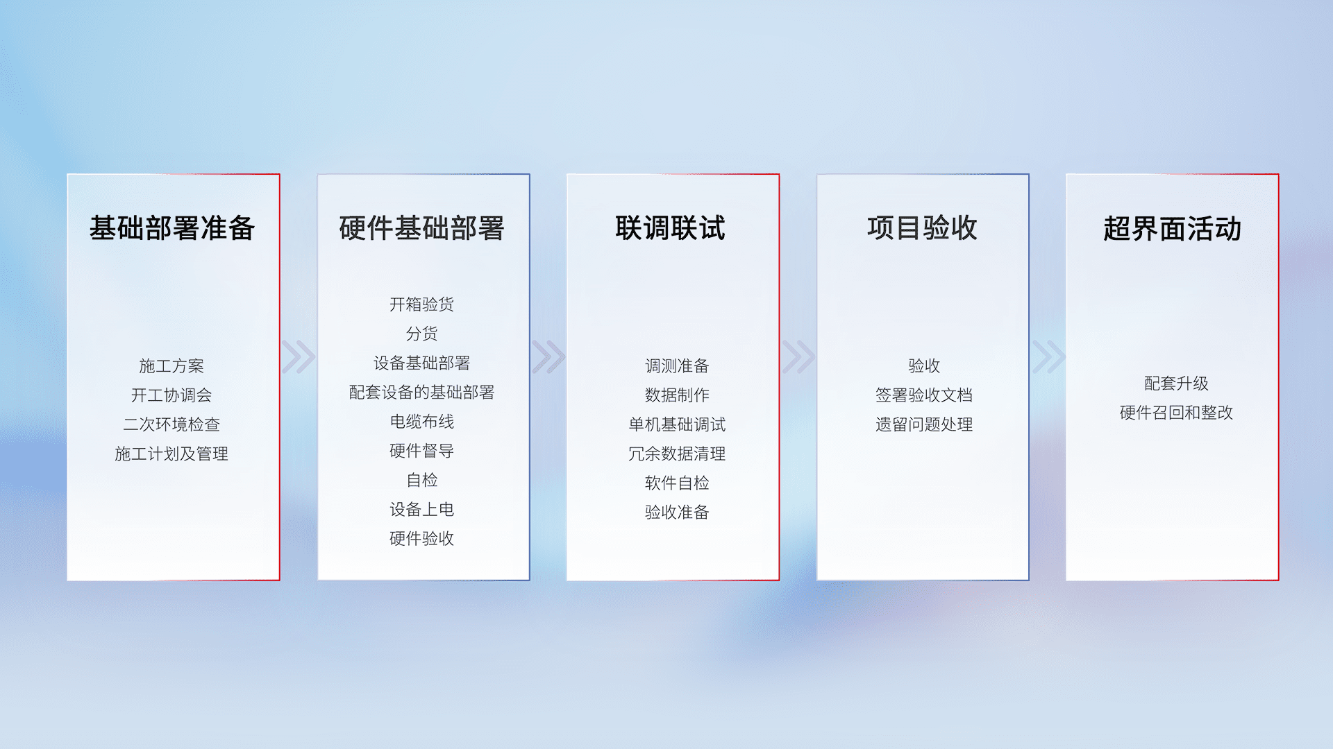 从基础部署准备、、硬件基础部署、、、联调联试、、项目验收、、、越界面活动的全过程可追溯,,保证施工质量和进度。。